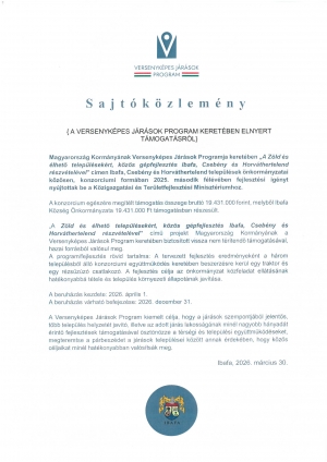 Magyarország Kormányának Versenyképes Járások Programja keretében „A Zöld és élhető településekért, közös gépfejlesztés Ibafa, Csebény és Horváthertelend részvételével” címen Ibafa, Csebény és Horváthertelend települések önkormányzatai közösen, konzorciumi formában 2025. második félévében fejlesztési igényt nyújtottak be a Közigazgatási és Területfejlesztési Minisztériumhoz. A konzorcium egészére megítélt támogatás összege bruttó 19.431.000 forint, melyből Ibafa Község Önkormányzata 19.431.000 Ft támogatásban részesült. „A Zöld és élhető településekért, közös gépfejlesztés Ibafa, Csebény és Horváthertelend részvételével” című projekt Magyarország Kormányának a Versenyképes Járások Program keretében biztosított vissza nem térítendő támogatásával, hazai forrásból valósul meg. A program/fejlesztés rövid tartalma: A tervezett fejlesztés eredményeként a három településből álló konzorciumi együttműködés keretében beszerzésre kerül egy traktor és egy rézsűzúzó csatlakozó. A fejlesztés célja az önkormányzat közfeladat ellátásának hatékonyabbá tétele és település környezeti állapotának javítása. A beruházás kezdete: 2026. április 1. A beruházás várható befejezése: 2026. december 31. A Versenyképes Járások Program kiemelt célja, hogy a járások szempontjából jelentős, több település helyzetét javító, illetve az adott járás lakosságának minél nagyobb hányadát érintő fejlesztések támogatásával ösztönözze a térségi és települési együttműködéseket, megteremtse a párbeszédet a járások települései között annak érdekében, hogy közös céljaikat minél hatékonyabban valósítsák meg. Ibafa, 2026. március 30.