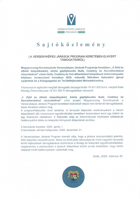 „A Zöld és élhető településekért, közös gépfejlesztés Ibafa, Csebény és Horváthertelend részvételével” című projekt Magyarország Kormányának a Versenyképes Járások Program keretében biztosított vissza nem térítendő támogatásával, hazai forrásból valósul meg.